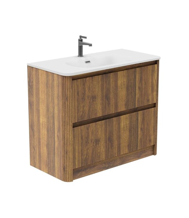 Het geribbelde badkamerkastje is een stijlvolle en functionele toevoeging aan elke landelijke badkamer. Het hout in de kleur walnoot met ribbelstructuur zorgt voor een luxe en unieke uitstraling.