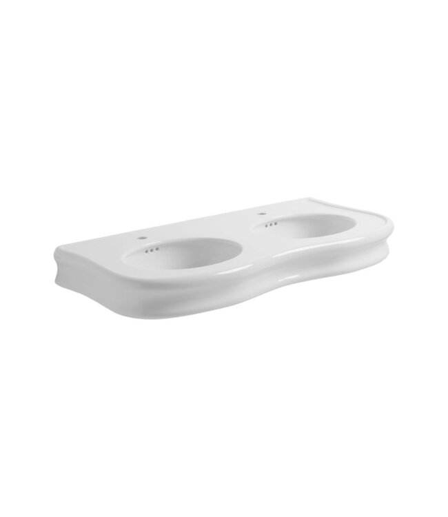 De wastafel is vervaardigd uit hoogwaardig keramiek, wat zorgt voor: Sterke, krasbestendige afwerking Eenvoudig onderhoud Lange levensduur Hygiënisch en waterbestendig oppervlak Installatie & specificaties Breedte: 120 cm Type: dubbele wandwastafel Kraangaten: 1 of optioneel 3 Montage: wandmontage De dubbele wastafel kan eenvoudig worden geïntegreerd in luxe badkamermeubels of gecombineerd worden met het klassieke wastafelonderstel voor een nog rijkere uitstraling.