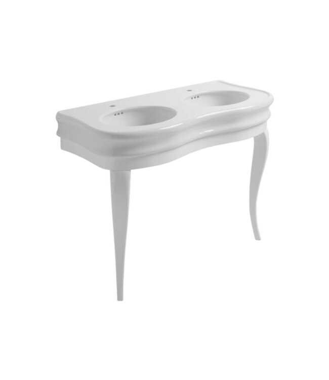 De Toulon dubbele wastafel in combinatie met het onderstel op twee poten is een stijlvolle badkameroplossing die klassieke charme combineert met een open, luchtige uitstraling. Deze set van 120 cm breed is ideaal voor wie een elegante dubbele wastafel wil zonder het massieve karakter van een gesloten meubel.