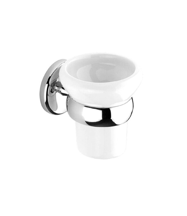 Klassieke bekerhouder met één porseleinen beker en inclusief muurmontage. De bekerhouder met enkele beker is een onmisbaar accessoire voor de klassieke badkamer. Leverbaar in de kleuren chroom en nikkel.