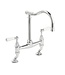 Klassieke 2-gats keukenkraan van hoge kwaliteit voor bladmontage. Voorzien van een draaibare Franse uitloop. Leverbaar in de kleuren chroom, nikkel en messing.