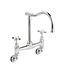 Klassieke 2-gats keukenkraan van hoge kwaliteit voor wandmontage. Voorzien van een draaibare Franse uitloop. Leverbaar in de kleuren chroom, nikkel en messing.
