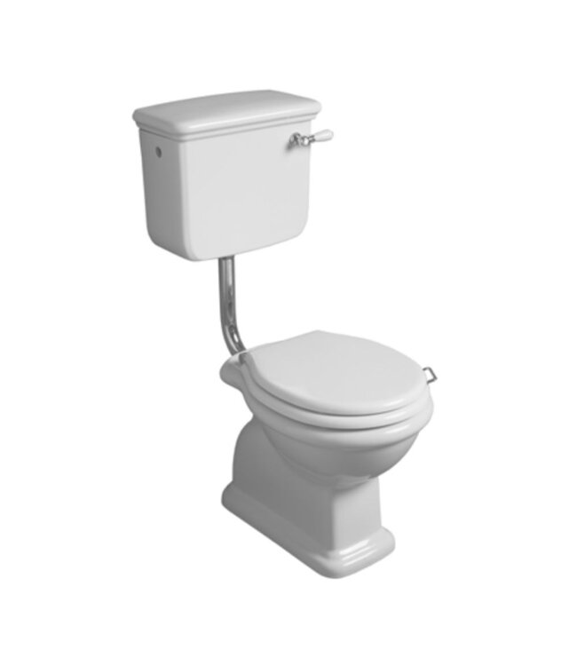 Het halfhoog systeem toilet biedt tevens een klassieke uitstraling en neemt minder ruimte in beslag dan een hooghangend klassiek reservoir. Het toilet heeft een doorspoelhendel met witte porseleinen handgreep aan de voorkant van de stortbak.